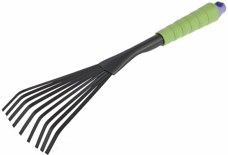 - Грабли веерные 9-зубые для сбора срезанных побегов и сорняков на небольших грядках и клумбах, ширина рабочей части 130 мм, общая длина 410 мм.