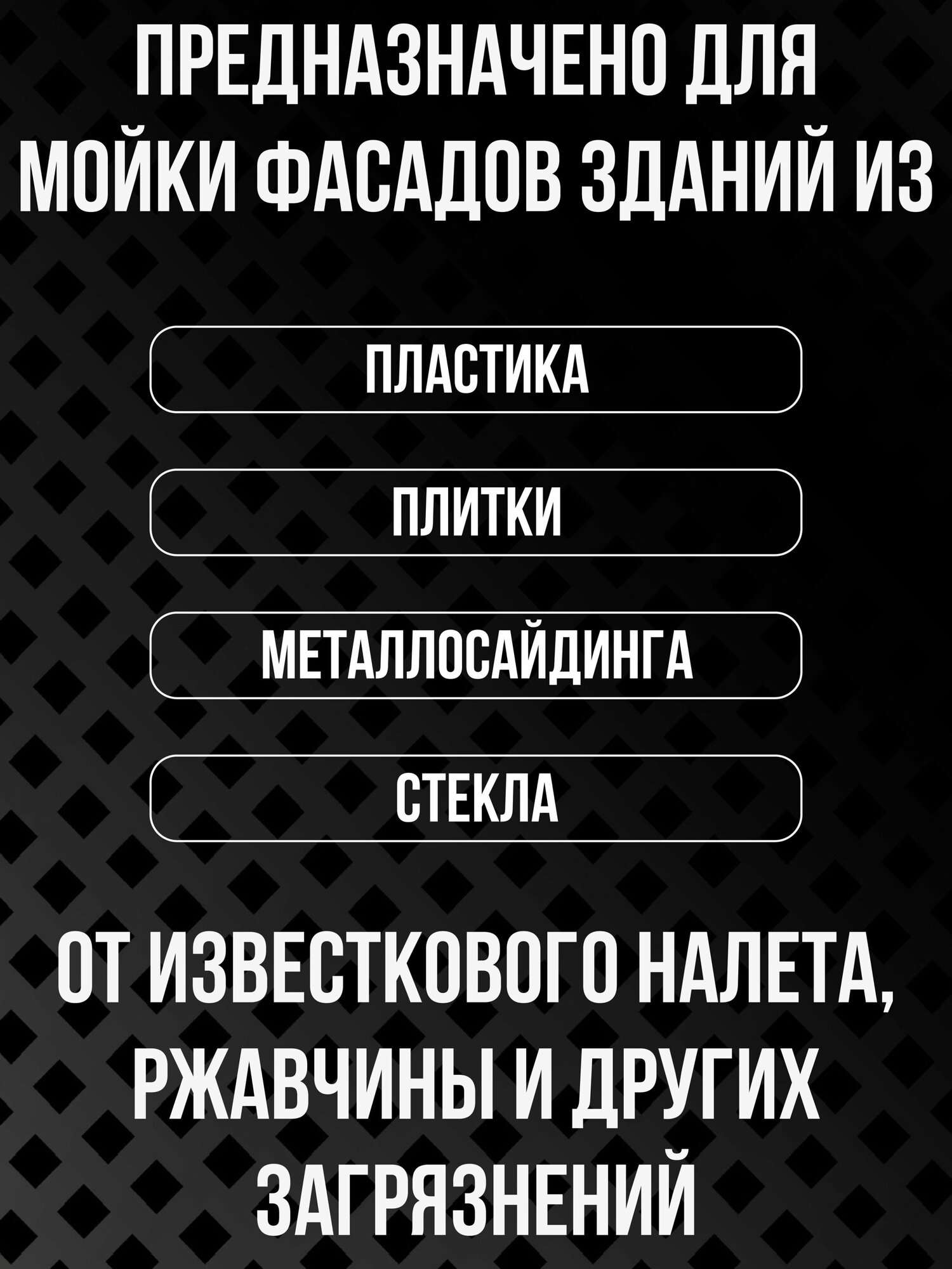 Средство отлично очищает от известкового налета, ржавчины и других загрязнений минерального характера. Особо зарекомендовало себя на автомойках. Способ применения: -Нанести на загрязненную поверхность с помощью распылителя или губки, оставить на 2 - 3 минуты, при необходимости потереть щеткой и смыть водой; - При регулярном применении препарата или несильном загрязнении, можно разбавить концентрат с водой 150 - 200 г/л. Предназначено для мойки фасадов зданий, отделанных пластиком, плиткой, металлосайдингом, стеклом. Вид средства: жидкость; Вес: 5,9 кг; Назначение: очищение фасадов зданий; Состав: очищенная вода, смесь неорганических кислот, неионогенные ПАВ, краситель.