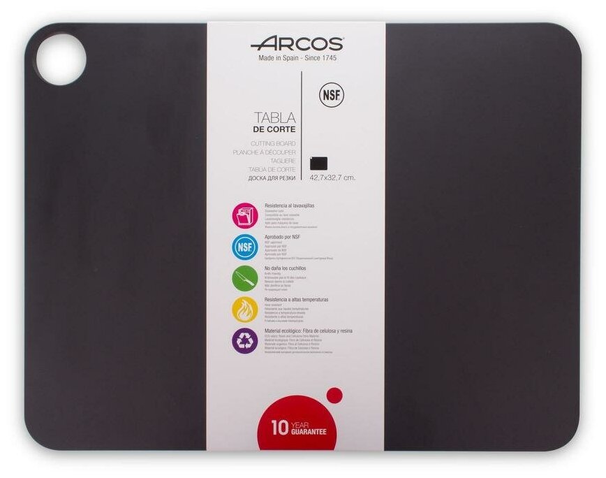 Разделочная доска от производителя Arcos изготовлена из экологически чистого материала, специального деревянного волокна и имеет простой, функциональный дизайн. Поверхность разделочной доски не вредит ножам, устойчива к высокой температуре и легко моется в посудомоечной машине.Особая технологическая обработка, одобренная национальным научным Фондом США, придает материалу несколько степеней защиты в агрессивной кухонной среде.
