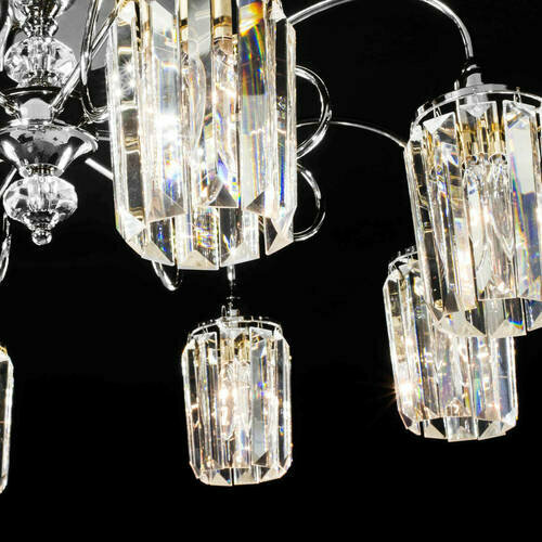 Люстра очень красивая, хрусталь приятно звенит :) Сначала не поняли, как закрепить лучи, в инструкции не написано. Оказалось, нужно разобрать центральную коробку и закрутить гайки изнутри.