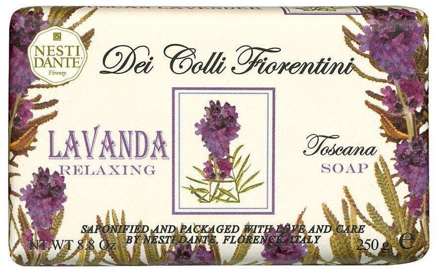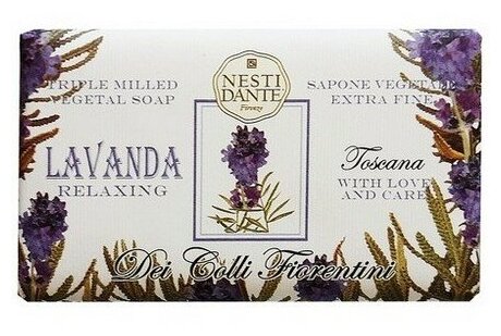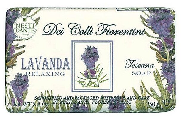 Великолепное растительное мыло премиум-класса Nesti Dante "Dei Colli Fiorentini. Лаванда" изготовлено по старинным рецептам и по традиционной котловой технологии, в составе мыла только натуральные оливковое и пальмовое масло высочайшего качества, для ароматизации использованы органические эфирные масла. Ежедневный ритуал красоты, любви и заботы не только для тела, но и для душиРастительное кусковое мыло ручной работы. Изысканная флорентийская бумага, в которую завернуто мыло, расписана акварелью, на каждом кусочке мыла выгравирована надпись "With Love And Care (С любовью и заботой)"
