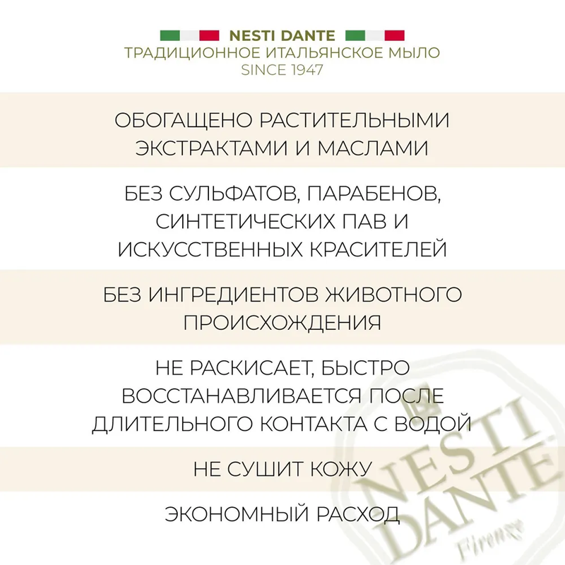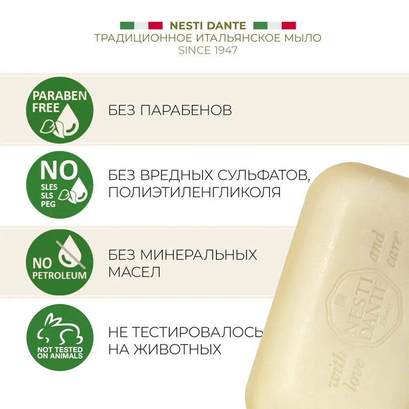 Натуральное растительное мыло с регенерирующим действием растительного коллагена делает кожу гладкой и упругой. Nesti Dante экологически чистое мыло, обогащенное растительными экстрактами и маслами. Не содержит вредных поверхностно-активных веществ, сульфатов, парабенов, синтетических масел и искусственных красителей. Без аллергенов и ингредиентов животного происхождения. Кусок мыла не размокает и быстро восстанавливается после длительного контакта с водой.