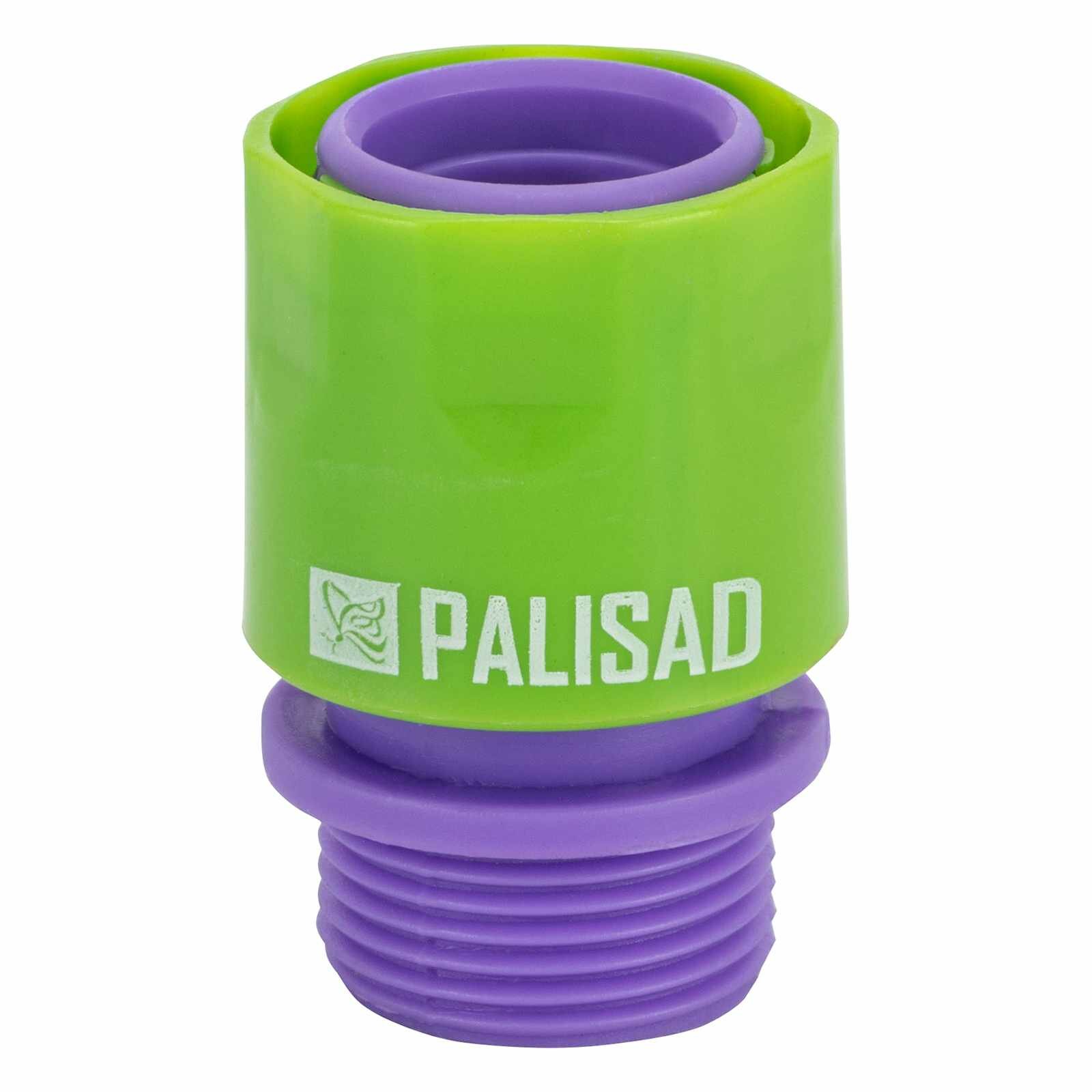 Пластмассовый быстросъемный соединитель Palisad с внешней резьбой 3/4 дюйма используется для подключения шланга через переходник к крану или отводу, имеющему выход с внутренней резьбой. Облегчает монтаж поливочной линии на дачном участке.