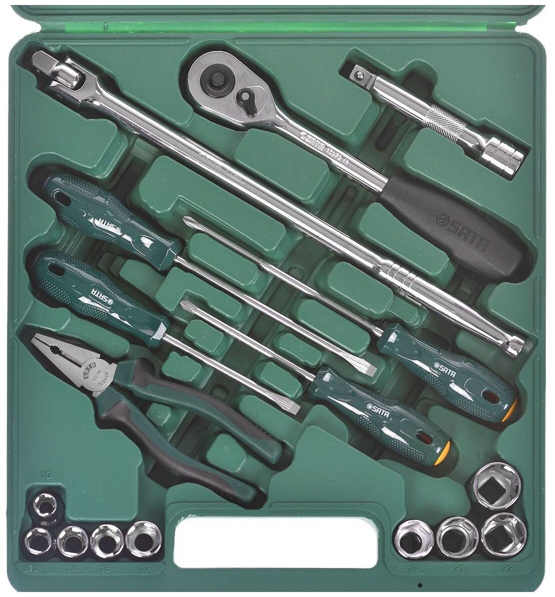 26PC 12DR SOCKET TOOL SET (METRIC) Набор инструментов (комбинированный). Головки торцовые 12 6 граней: 10мм, 12мм, 14мм, 16мм, 17мм, 19мм, 21мм, 22мм, 24мм. Ключи комбинированные: 8мм, 10мм, 12мм, 14мм, 16мм, 17мм, 19мм. Ключ трещеточный 12. Удлинитель 12 125мм. Рычаг угловой 12 260мм. Отвертки Phillips: РН2х100мм, РH2х150мм. Отвертки шлицевые: 6ммх100мм, 6ммх150мм. Тонкогубцы 150мм. Бокорезы 160мм. Плоскогубцы 180мм. Преимуществом любого набора марки SATA является то, что любую его составляющую вы можете приобрести отдельно.