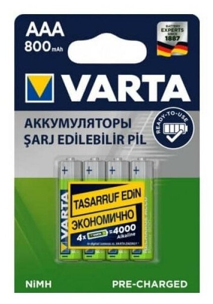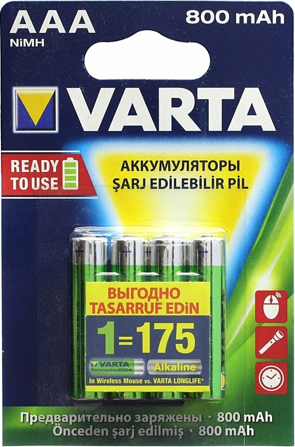Если Вы ежедневно пользуетесь устройствами, требующими питание от батареек (фонари, фото и видео техника, игрушки и т. д.), то Вы наверняка, задумывались об экономии денежных средств. Для решения этой проблемы предлагаем Вам линейку аккумуляторов VARTA R2U Ready To Use. Четыре мощных аккумулятора емкостью 800 mAh обладают низким саморазрядом и способны сохранять до 75% заряда до 1 года с момента последнего заряда. Оба аккумулятора предзаряжены и готовы к работе! Для всех неравнодушных к окружающей среде, аккумуляторы Varta станут настоящим союзником, так как позволят пользоваться ими снова и снова, не приобретая и утилизируя обыкновенные батарейки. Благодаря VARTA R2U Ready To Use теперь Вы сможете максимально экономно пользоваться различными гаджетами, не тревожась, что внезапно устройство отключится! особенности модели: ● Емкость - 800 mAh ● Низкий саморазряд | Сохраняет до 75% до 1 года с момента последнего заряда ● 4 аккумулятора в комплекте ● Подходит для использования в экшн-камерах, фотоаппаратах, фонарях ● Тип - ААА ● Выходное напряжение - 1,2 В ● Подходит для любого зарядного устройства ● Упаковка сингл пресс аут технические характеристики: ● Типоразмер – ААA ● Напряжение – 1,2 В ● Емкость – 800 мАч ● Электрохимическая система – Никель-металлогидридный (Ni-MH) ● Длина – 44,5 мм ● Вес – 11,4 гр.