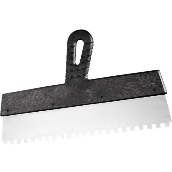 | Прочие особенности и свойства | Полотно шпателя изготовлено из нержавеющей стали., Рабочая поверхность инструмента имеет квадратные зубья., Облегченная ручка из ударопрочной пластмассы., Ручка шпателя имеет специальную изогнутую форму, что обеспечивает максимально удобную работу., Шпатель предназначен для нанесения, выравнивания и сглаживания шпаклевочного слоя на больших и малых поверхностях. |