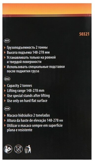| Описание | Домкрат является незаменимым инструментом в автосервисе, часто используется при проведении ремонтно-строительных работ. Минимальная высота подхвата домкрата Sparta составляет 148 мм. Максимальная высота, на которую домкрат может поднять груз, составляет 278 мм. Этой высоты достаточно для установки жесткой опоры под поднятый груз и проведения ремонтных работ. Гидравлический домкрат Sparta предназначен для подъема груза массой до 2 тонн. Модели Sparta выполнены на чугунном основании. |