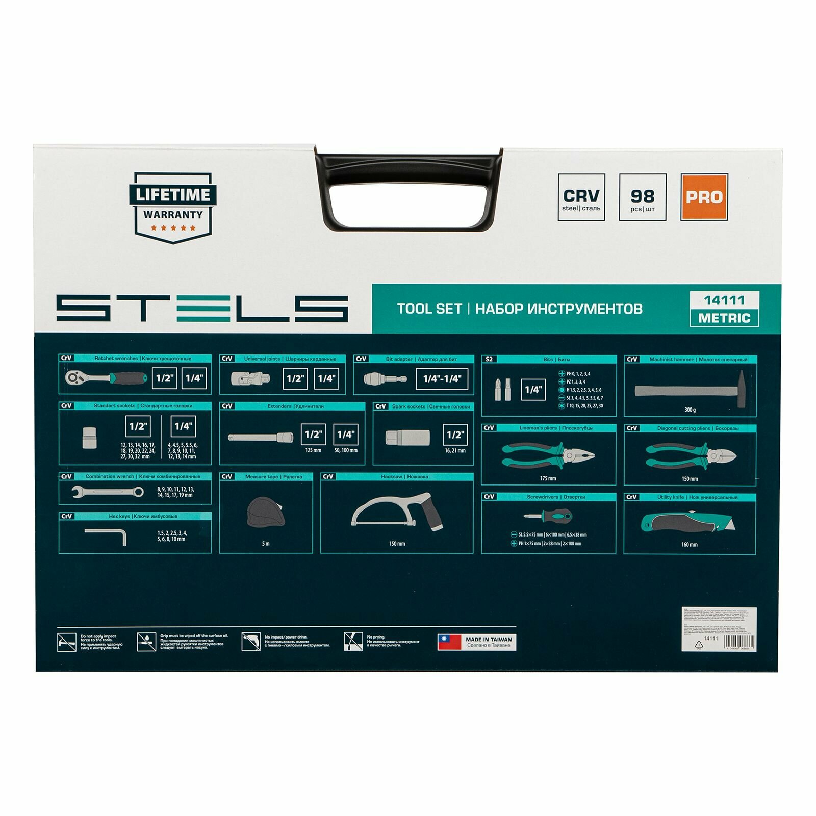 Набор инструментов для автомобиля универсальный, 98 предметов, STELS составлен из слесарного инструмента профессионального качества, имеющего расширенную гарантию, и может быть использован для ремонта автомобиля и в быту. Набор размещается в крепком пластиковом кейсе с надежными металлическими замками-защелками. Весь инструмент изготовлен из высококачественной легированной хром-ванадиевой стали.