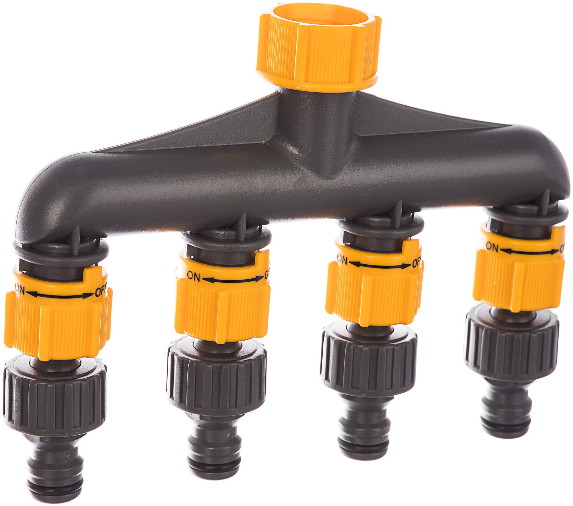 Предназначен для разветвления одной 3/4 линии подачи на четыре 3/4. На каждой отводной линии имеет вращающийся фиксатор для быстрого съема монтажа шланга на разветвитель. Материал высокопрочный пластик.