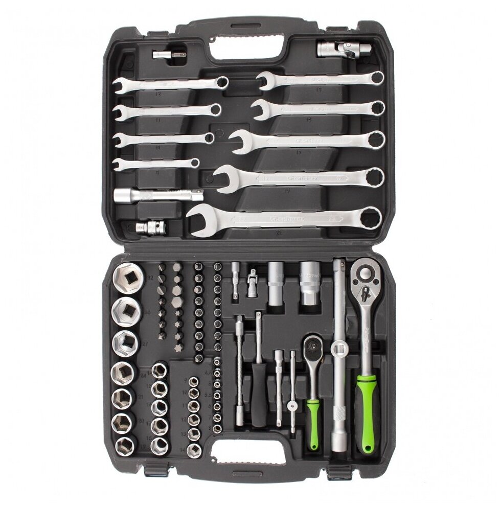 | Состав набора | Ключ трещоточный 1/4" Ключ трещоточный 1/2" Головки торцевые 1/2" Кейс, Головки торцевые 1/4" Головки свечные 21мм и 16мм Удлинители 1/2 125 и 250 мм Удлинители 1/4 100мм и 50 мм Кардан на 1/2 и 1/4 Вороток Т-образный 1/4" Головка торцевая удлиненная 1/2 Головка торцевая удлиненная 1/4 Бокорезы 175 мм Пассатижи 175 мм. Переходник бит 1/4"->1/4" Переходник 1/2"F - 3/8" M Отвертка-держатель 1/4" Отвертки SL6х100 PH2x100 Биты Т10, Т15, Т20. SL3, SL4. PH1, PH2 |