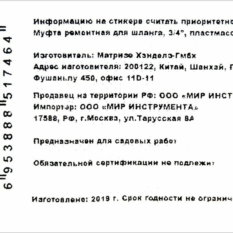 | Прочие особенности и свойства | Предназначена для быстрого соединения двух участков поливочного шланга с целью ремонта поврежденного участка или наращивания длины., Муфта соединительная 3/4., Материал прочный АБС-пластик., Надевается на шланг. |