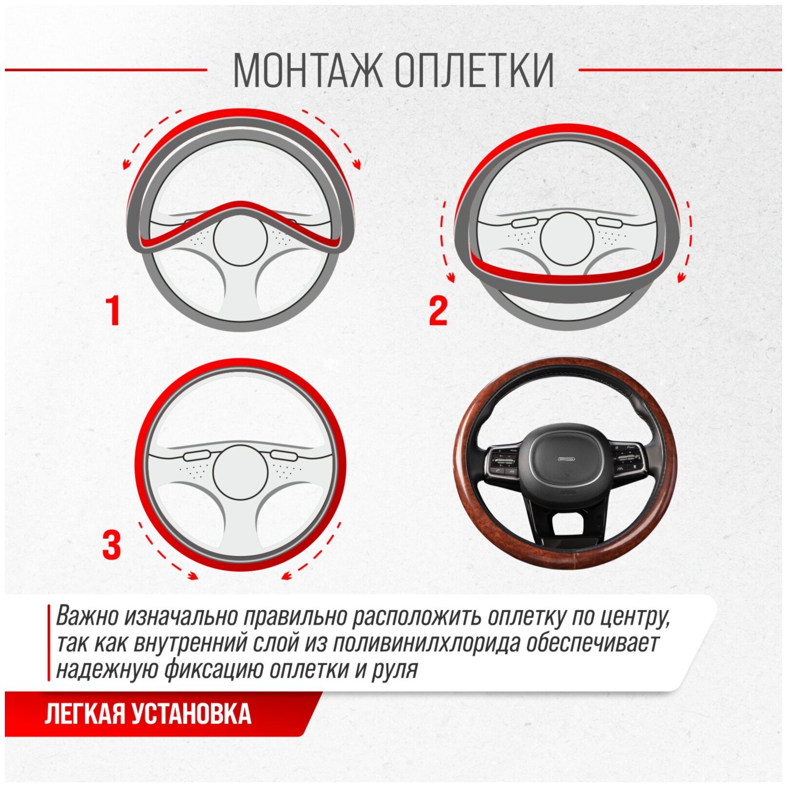 Оплетка на руль - сверхпопулярный автомобильный аксессуар. Сделана из высококачественного материала экокожа гладкая. Нейтральный коричневый цвет отлично вписывается в любой интерьер. Стильный дизайн выгодно подчеркнет хороший вкус автовладельца и его индивидуальность. Оплетка на руль Wood-4 размера «M» подходит на 90 % отечественных и зарубежных автомобилей. Чехол на руль автомобиля подойдет для Тойота, Гранта, Ларгус, Приора и многих других. На руль оплетка устанавливается легко, не требует долгих манипуляций, достаточно минимума усилий и предварительного нагрева для более легкого надевания. Поэтому справится даже хрупкая девушка.Внимание! Важно ознакомиться с последовательностью натягивания оплетки (см. слайд). Нагреть оплетку можно обычным феном, на солнце или горячим воздухом в машине.Тянется при установке, при этом отлично держит форму и плотно прилегает к рулю, повторяя его рельеф и изгибы. Вот почему чехол на руль автомобиля универсальный. Преимущества: износостойкая, без запаха, устойчива к царапинам и порезам.Чехол на руль с отменными рабочими характеристиками: скрывает имеющиеся потертости и царапины, уберегает от появления новых. Оплетка на руль не перегревается летом от солнечных лучей и не обжигает руки, а зимой не дубеет на морозе, не растрескивается, материал оплетки очень приятный на ощупь.За счет красивого внешнего вида чехол на руль автомобиля хорош как подарок девушке, как подарок мужчине в машину.Противоскользящий материал ПВХ с внутренней стороны гарантирует - оплетка не будет смещаться по ободу колеса, обеспечит крепкое сцепление с его поверхностью, что критично важно во время вращения руля.