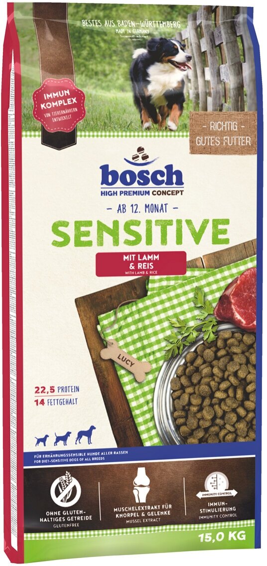 Корм для собак BOSCH Sensitive ягненок, рис разработан для собак с чувствительным пищеварением и склонных к аллергии. Основа рациона, мясо ягненка и рис, обладают низким аллергенным потенциалом, корм легко переваривается, снижая нагрузку на пищеварительный тракт. Оптимальное соотношение омега-з и омега-6 жирных кислот снижает зуд, снимает воспаление глаз, ушей, останавливает неконтролируемую линьку, возвращает здоровый блеск шерсти.