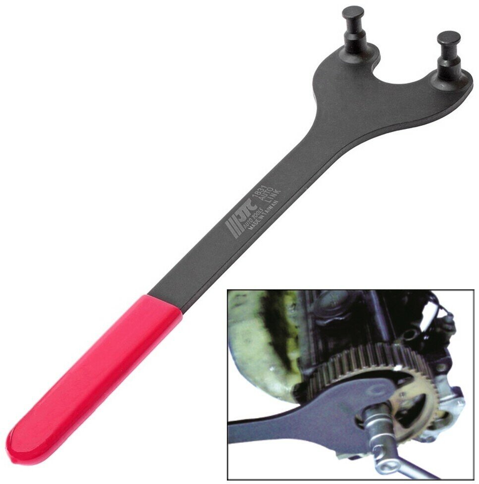 - Фиксатор имеет упорные штифты с канавками (бороздками), которые предназначены для фиксации шкива распределительного вала в неподвижном положении при откручивании центрального болта вала.