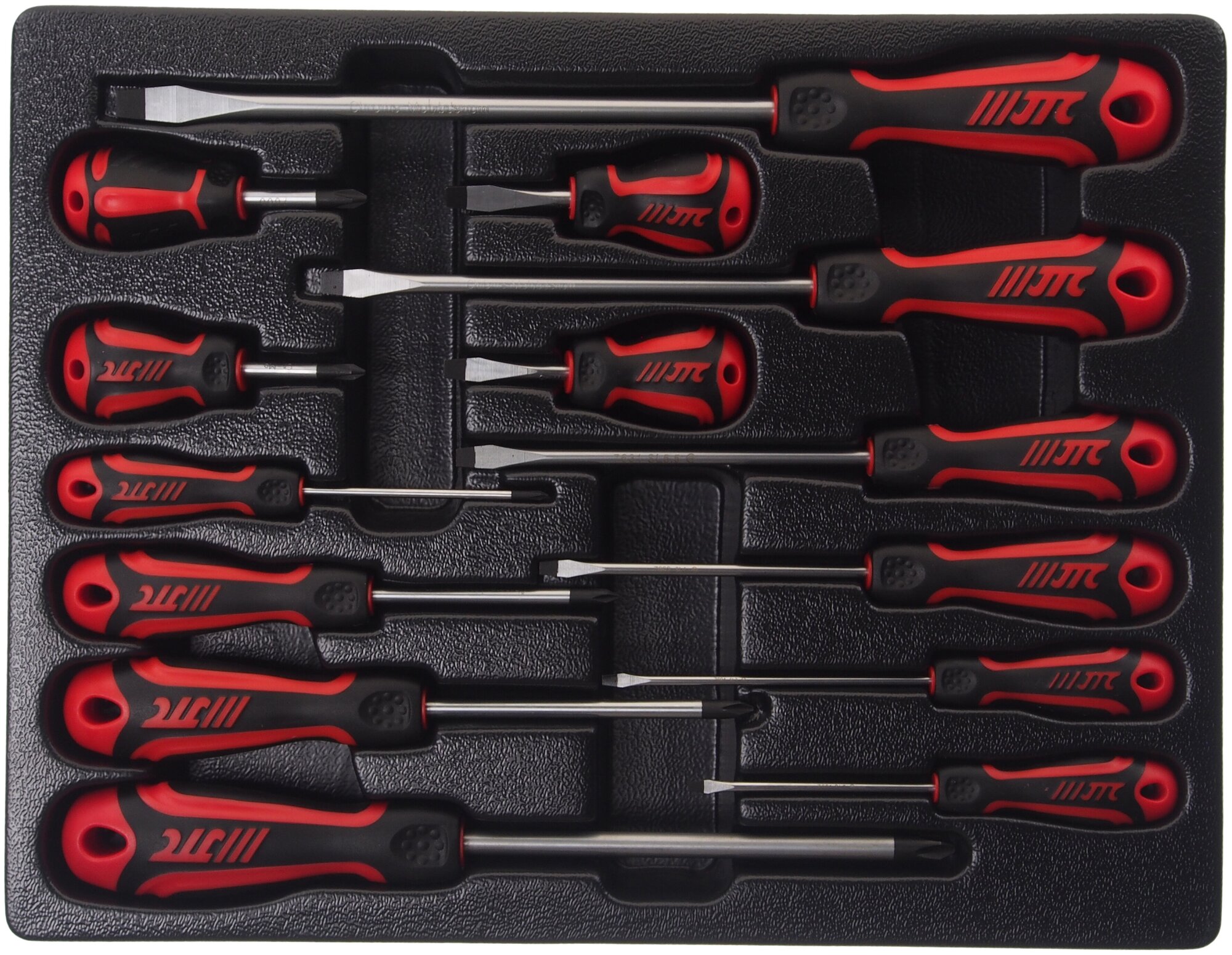 Набор силовых отверток JTC 14 шт. предназначен для работы с прикипевшим и трудноподдающимся крепежом, имеющим плоский и крестовой профиль. Каждая отвертка изготовлена из качественных материалов и оснащена двухкомпонентной рукояткой, обеспечивающей крепкий захват. Для более удобного хранения инструментов предусмотрен пластиковый ложемент с отдельными ячейками.