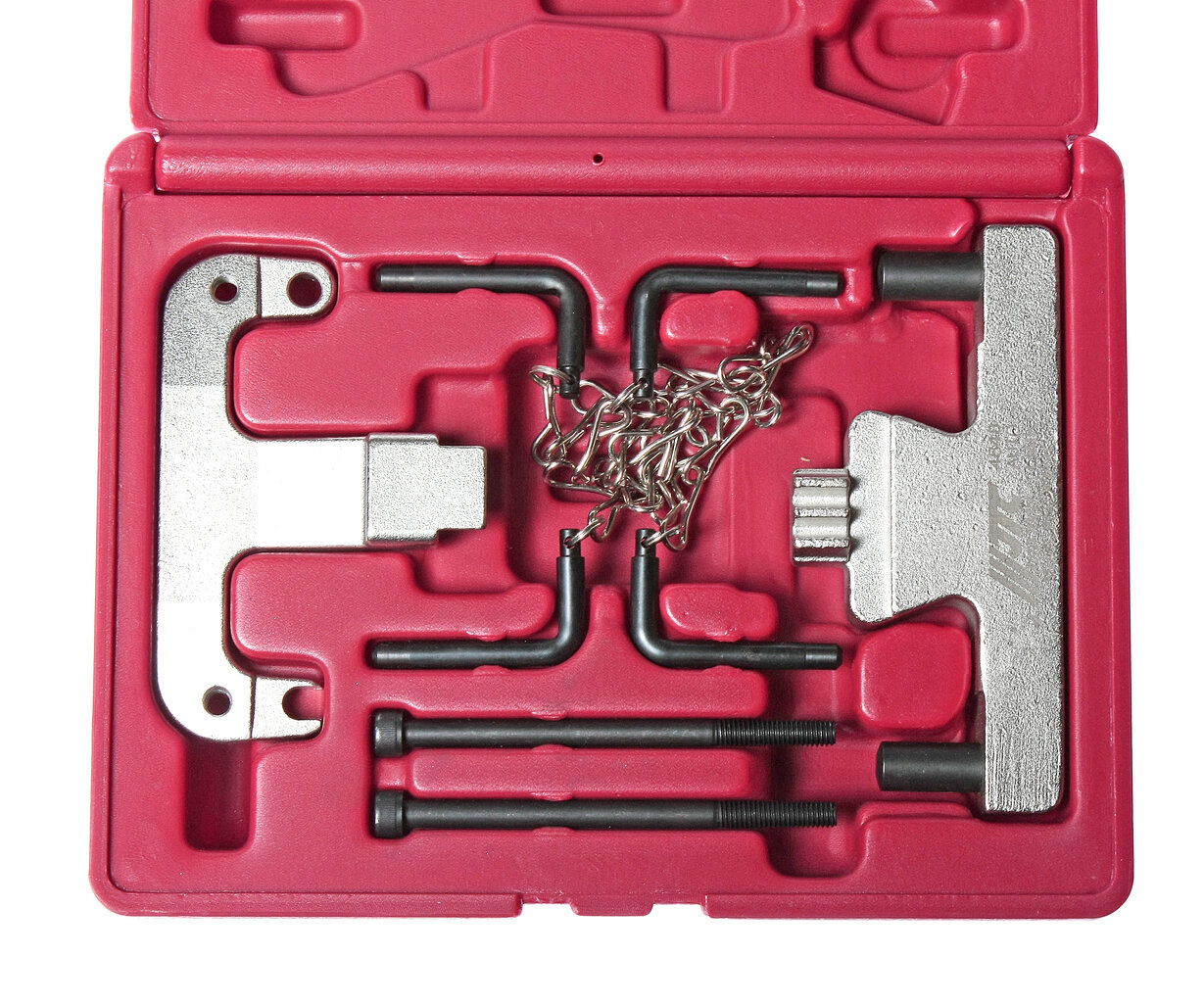 Приспособления позволяющие зафиксировать или демонтировать распредвалы и маховик и тем самым настроить газораспределительный механизм мотора. Устройства разрабатываются для применения с автомобилями компанией MERCEDES, CHRYSLER, JEEP. Инструменты изготавливаются в соответствии с европейским стандартом качества ISO 9001, что подтверждает долговечность и безопасность устройства.