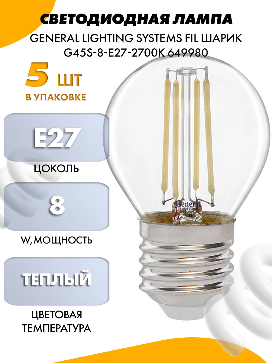 General шар P45 E27 8W 2700K 2K 45x76 филамент (нитевидная) прозр 649980 (арт. 614118)
