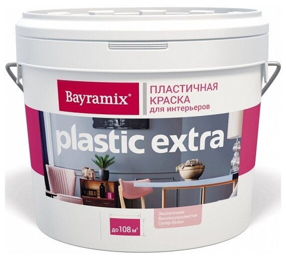 Водоэмульсионная краска для стен Plastic Extra - белая, матовая, эластичная акриловая краска для стен. Предназначена для окраски бетонных, асбестоцементных, кирпичных оштукатуренных, гипсокартонных, деревянных поверхностей стен и потолков внутри помещений, также наносится на стеклообои и обои под покраску. Рекомендуется для отделки жилых помещений с повышенной эксплуатационной нагрузкой.