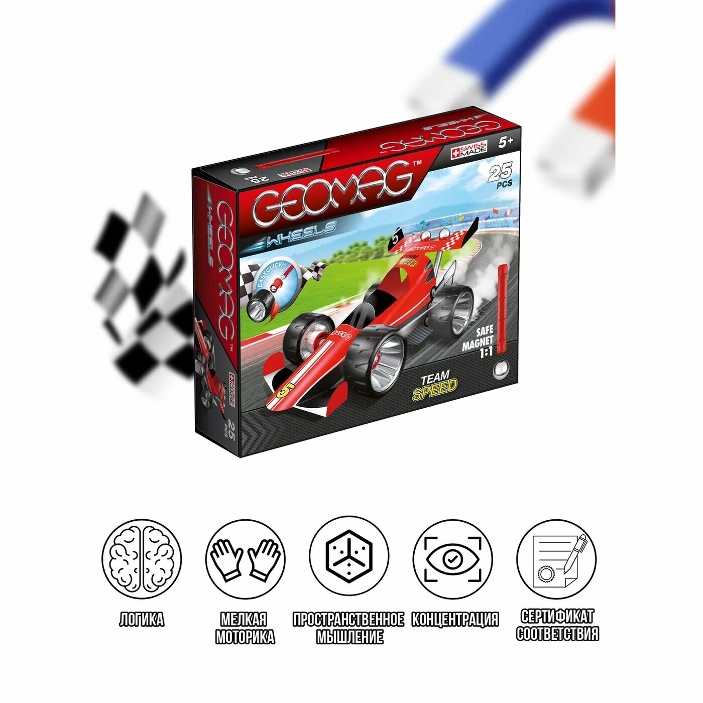 GEOMAG - это знаменитый магнитный конструктор из Швейцарии. Состоит из металлических шариков и стержней с магнитами на концах. Магниты выполнены из неодимового сплава и покрыты полипропиленом. Шарики с никелевым покрытием прочно удерживают стержни, создавая молекулоподобные конструкции.