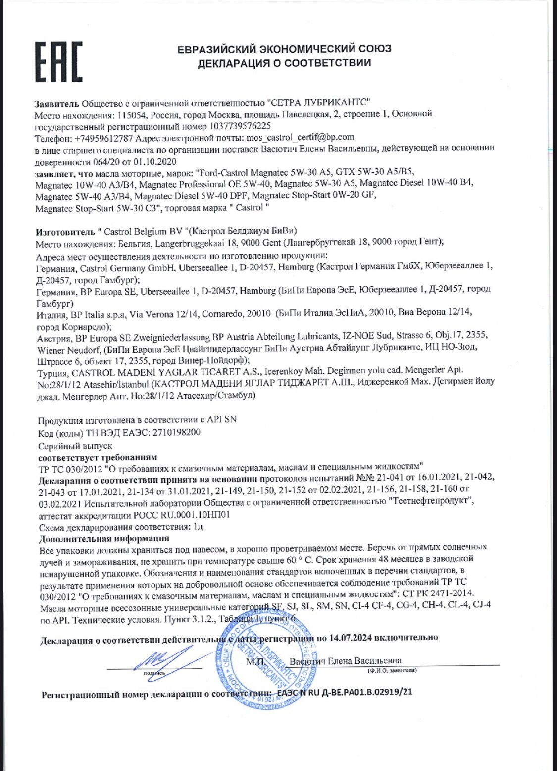 - Моторное масло Castrol Magnatec 5W-40 A3/B4 4 литра.