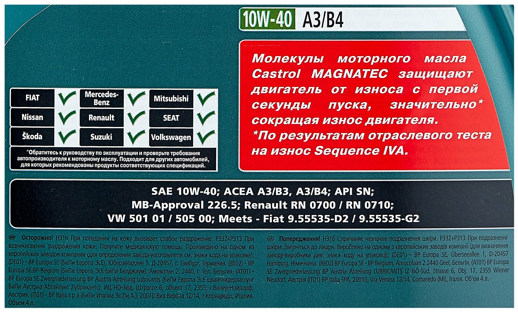 Castrol MAGNATEC:защита от износа в условиях прогрева двигателя при температуре ниже 0°C;доказанная эффективность в сочетании с российским топливом;сохраняет свойства в тяжелых городских условиях эксплуатации, в том числе при длительной работе двигателя на холостом ходу. Перейдите по ссылке, чтобы узнать подробнее об преимуществах нового Castrol MAGNATEC, протестированного в российских условиях, о защите канистры и новом дизайне.До 75% износа двигателя происходит во время его пуска и прогрева. Когда двигатель выключен, обычное масло стекает в поддон картера, оставляя важнейшие детали двигателя незащищенными. Молекулы Castrol MAGNATEC подобно магниту притягиваются к деталям двигателя и образуют сверхпрочную масляную пленку, обеспечивающую дополнительную защиту двигателя в период пуска, когда риск возникновения износа существенно возрастает.Уникальная композиция Castrol MAGNATEC защищает двигатель с момента пуска, существенно* снижая износ его деталей.* - по результатам теста на износ Sequence IVAПреимущества:удерживаются на важнейших частях двигателя, когда обычное масло стекает в поддон картера;притягиваются к деталям мотора, образуя устойчивый защитный слой, сохраняющийся с первой секунды его работы вплоть до следующего пуска;сцепляются с металлическими поверхностями компонентов двигателя, делая их более устойчивыми к изнашиванию;в сочетании с синтетической технологией обеспечивают повышенную защиту при высоко- и низкотемпературных режимах работы двигателя;обеспечивают постоянную защиту при различных стилях вождения, в любых условиях эксплуатации и широком диапазоне температур.Спецификации:ACEA A3/B3, A3/B4API SNMB-Approval 226.5Renault RN 0700 / RN 0710VW 501 01 / 505 00Meets - Fiat 9.55535-D2 / 9.55535-G2