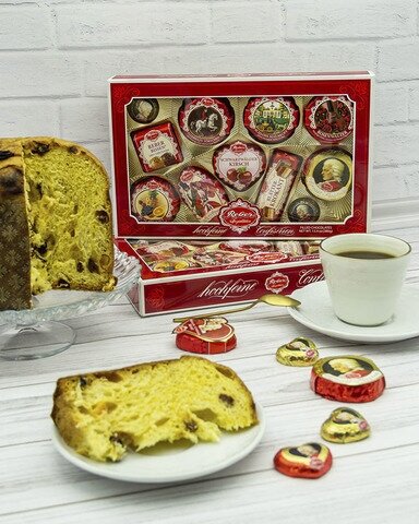 | Состав | сахар, миндаль, какао масло, какао тертое, лесные орехи, цельное сухое молоко, изюм, вишня, кусочки ананаса, сливки, сливочное масло, лактоза, апельсиновые цукаты, порошок яичного желтка, вишневый джем, порошок яичного белка, фисташки, молочный жир, инвертированный сахарный сироп, яичный ликер, воздушный рис, пищевой спирт, бренди, ром, ликер Grand Marnier, кирш (вишневый бренди), мед, инвертаза, агент влагоудерживающий: глицерин, эмульгатор: подсолнечный лецитин, натуральные ароматизаторы |
