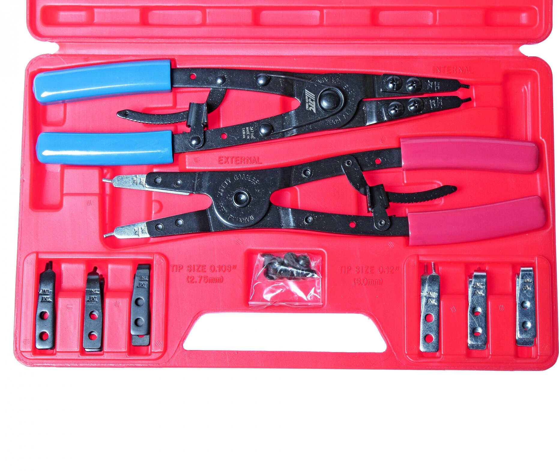- В набор входят сменные наконечники. Клещи с механизмом фиксации позволяют удерживать стопорные кольца, предохраняя их от повреждения.