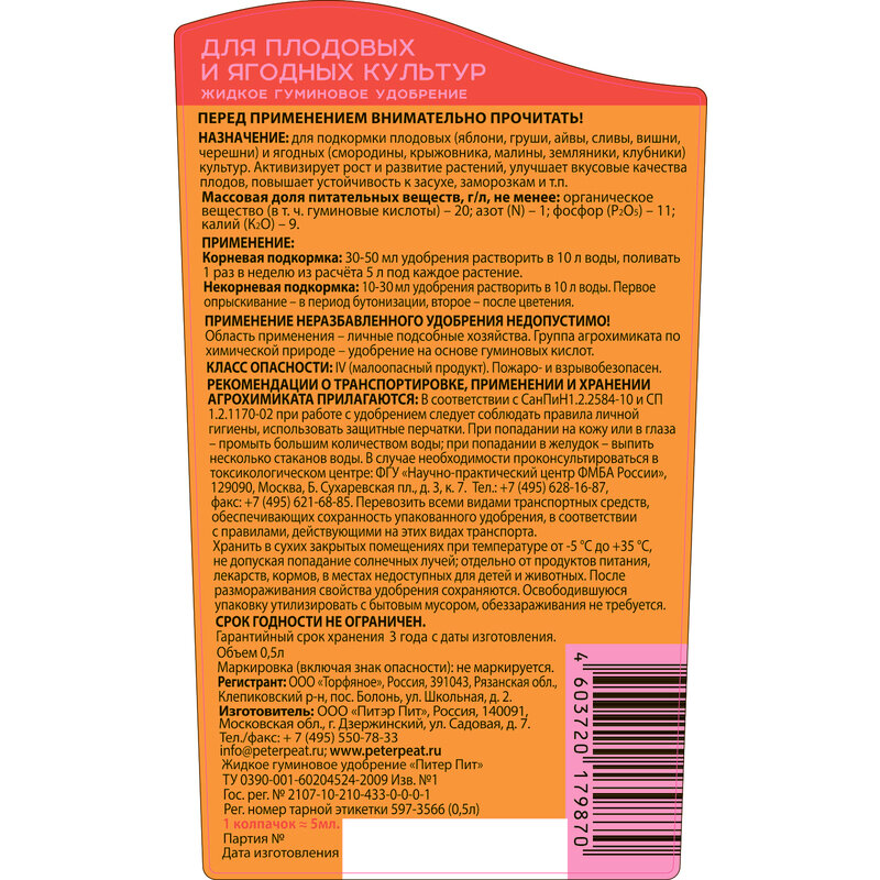 Для подкормки плодовых (яблони, груши, айвы, сливы, вишни, черешни) и ягодных (смородины, крыжовника, малины, земляники, клубники) культур. Активизирует рост и развитие растений, улучшает вкусовые качества плодов, повышает устойчивость к засухе, заморозкам.