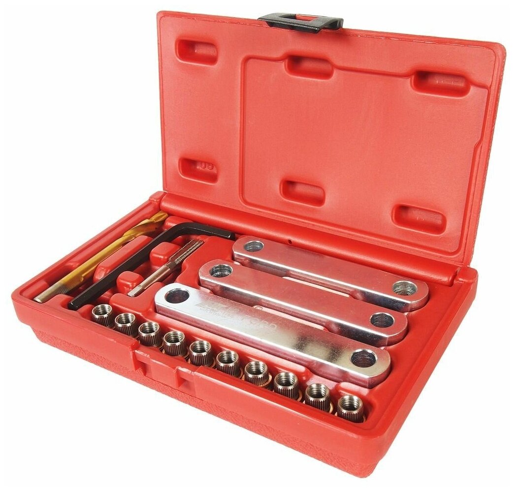 - Применение данного набора обеспечивает быстрое восстановление поврежденной резьбы при помощи специальных приспособлений.