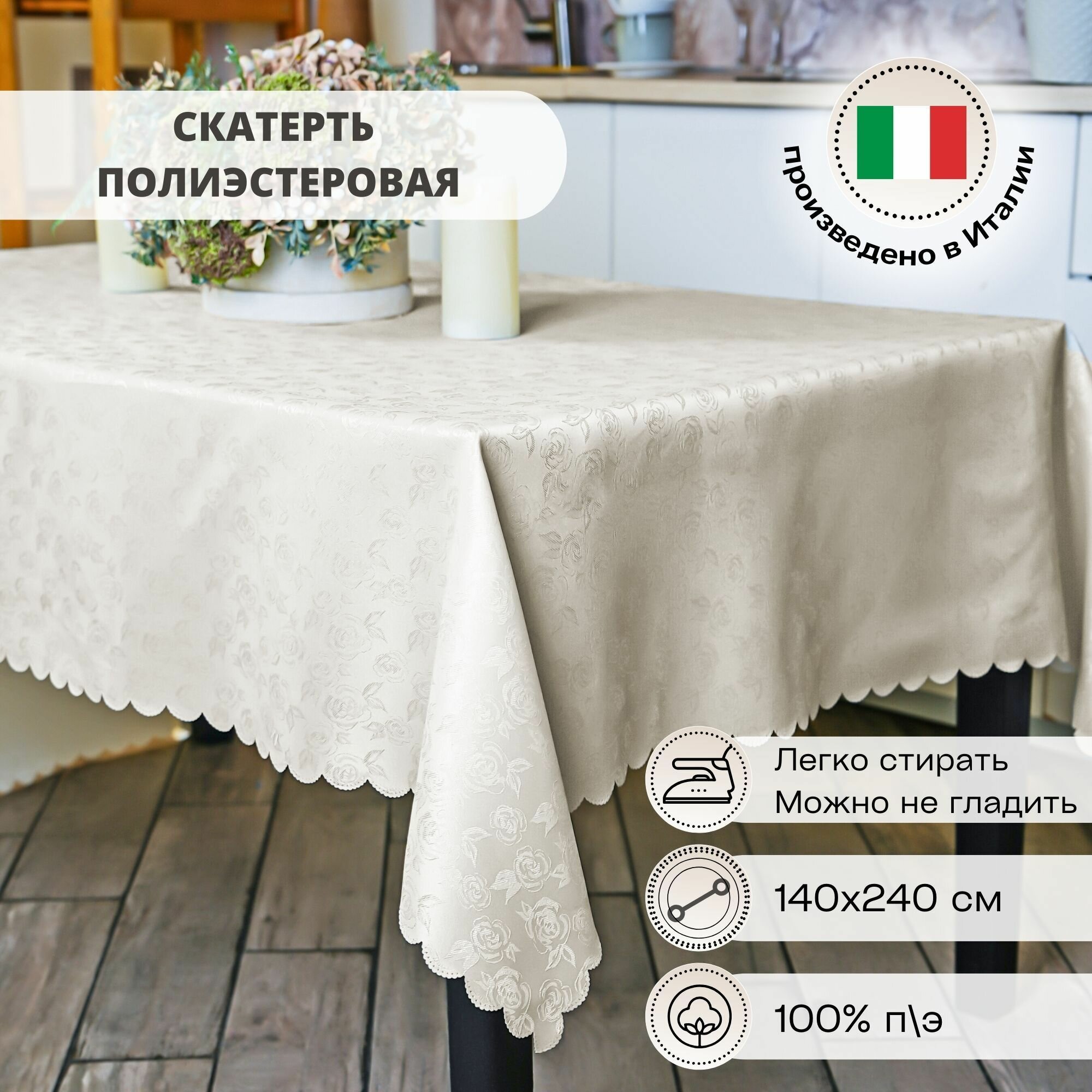Скатерть на стол 140х240 см Grand Textil. Скатерть подойдет на случай праздника, дружеского застолья или повседневного использования. Коллекция товаров для дома итальянского бренда выполнена в разнообразной цветовой гамме, что позвляет подобрать скатерть прямоугольную именно под ваш декор для дома. / Скатерть тканевая на стол выполнена из качественного, плотного материала. Состав: 100% полиэстер. Скатерти из полиэстера нового поколения легко отстирываются от загрязнений любой сложности, быстро сохнут, не мнутся, не линяют, не теряют цвет, сохраняя первоначльный вид на многие годы. Скатерти при необходимости можно стирать в машинке при температуре до 30° С. / Скатерть для стола - это необходимый аксессур для дома и кухни. В нашем каталоге большой выбор скатертей на стол тканевых: скатерть белая; скатерть праздничная для кухни с яркими и сочными принтами; скатерть на стол прямоугольная в теплых бежевых и молочных тонах; скатерть однотонная, которую можно дополнить дорожкой на стол.