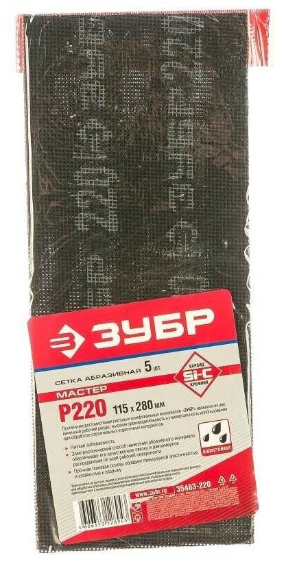 Шлифовальная сетка ЗУБР МАСТЕР абразивная, водостойкая № 220, 115х280миллиметра, 5 листов. Применяется на электрических плоскошлифовальных машинках и ручных терках для первичной обработки шпатлевок, оштукатуренных поверхностей, стыковых швов гипсокартонных плит, а также металлических и деревянных конструкций.