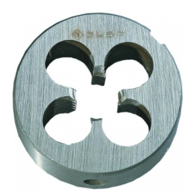 | Прочие особенности и свойства | Плашка ЗУБР серии "Мастер" предназначена для выполнения работ по нарезанию вручную внешней метрической резьбы за один проход на изделиях из цветных металлов и стали. Данный тип изделия произведен из легированной инструментальной стали высокого качества, что значительно повышает прочность и повышает длительность использования плашки. Представленная модель изделия представляет собой специальную закаленную гайку с осевыми отверстиями, которые образуют режущие кромки. Для того чтобы получить наилучшие результаты и снять общую нагрузку рекомендуется при выполнении нарезки резьбы применять специальные смазывающие материалы.,Назначение:для нарезки метрической резьбы.,Количество изделий в упаковке:1 штука.,Размеры изделия |