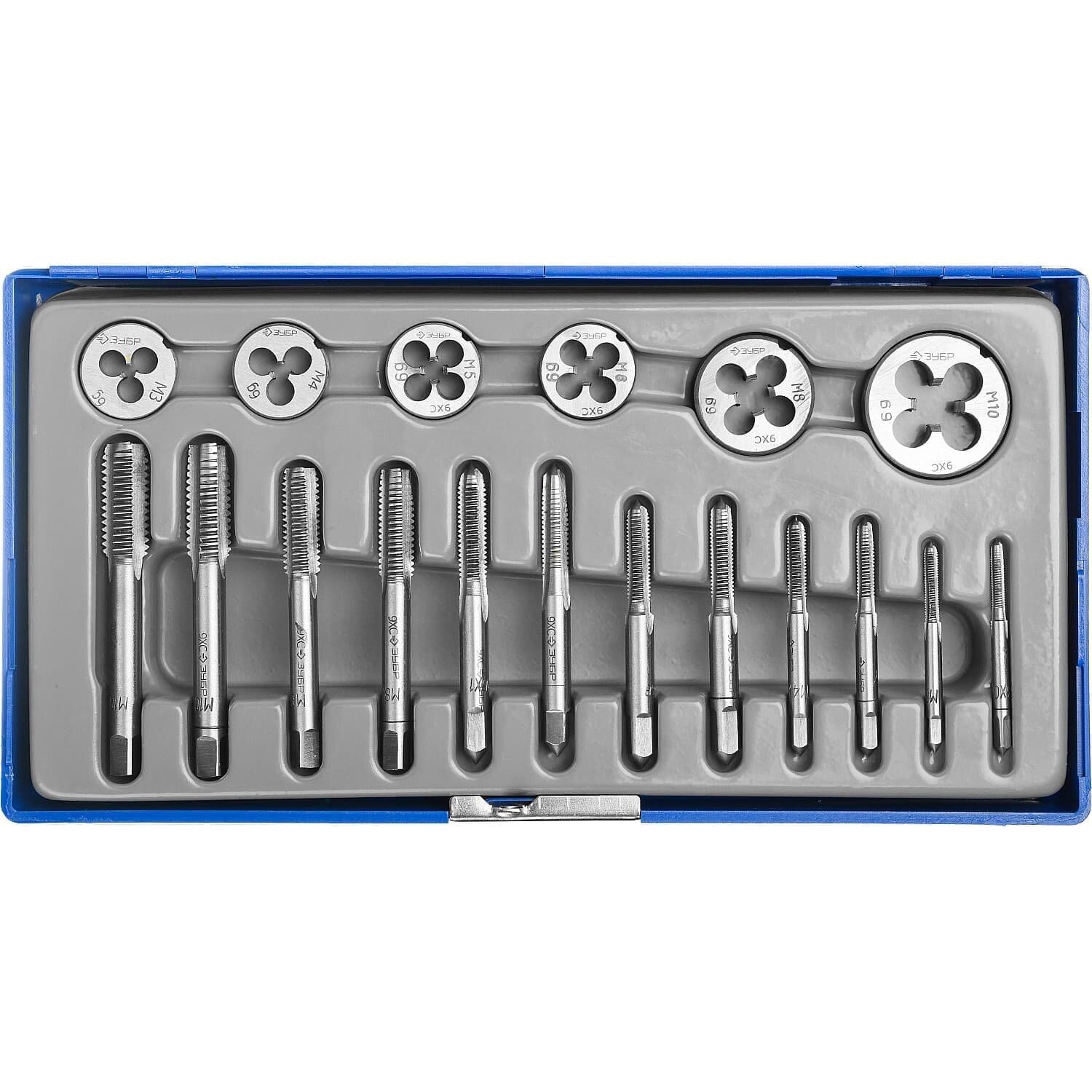 ЗУБР 18 предметов, набор метчиков и плашек в пластиковом боксе, сталь 9ХС