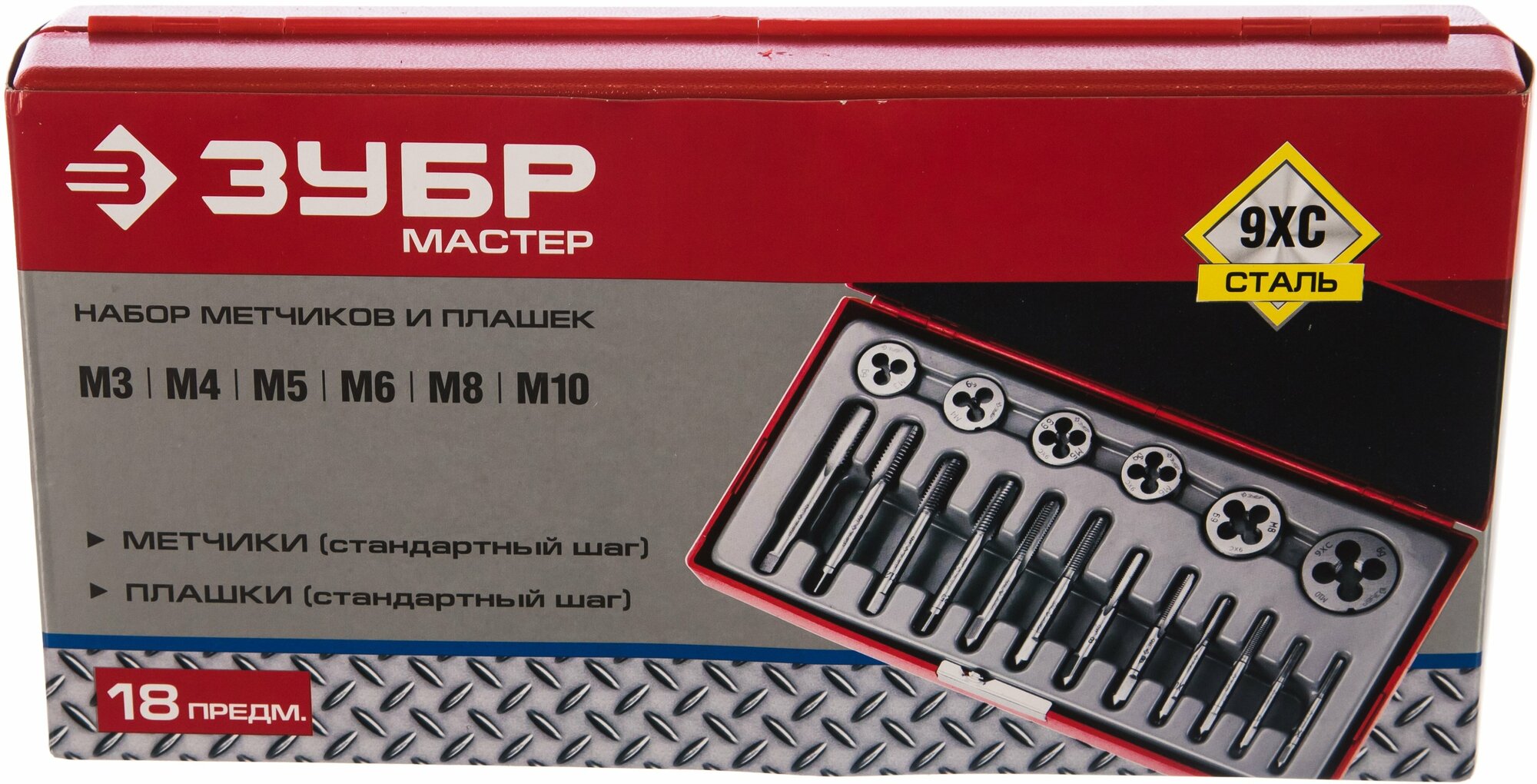 | Комплектация | Плашка (3х0,5);Плашка (4х0,7);Плашка (5х0,8);Плашка (6х1,0);Плашка (8х1,25);Плашка (10х1,5);Метчики комплектные (3х0,5) - 2 шт;Метчики комплектные (4х0,7) - 2 шт;Метчики комплектные (5х0,8) - 2 шт;Метчики комплектные (6х1,0) - 2 шт;Метчики комплектные (8х1,25) - 2 шт;Метчики комплектные (10х1,5) - 2 шт;Металлический бокс -1 шт. |