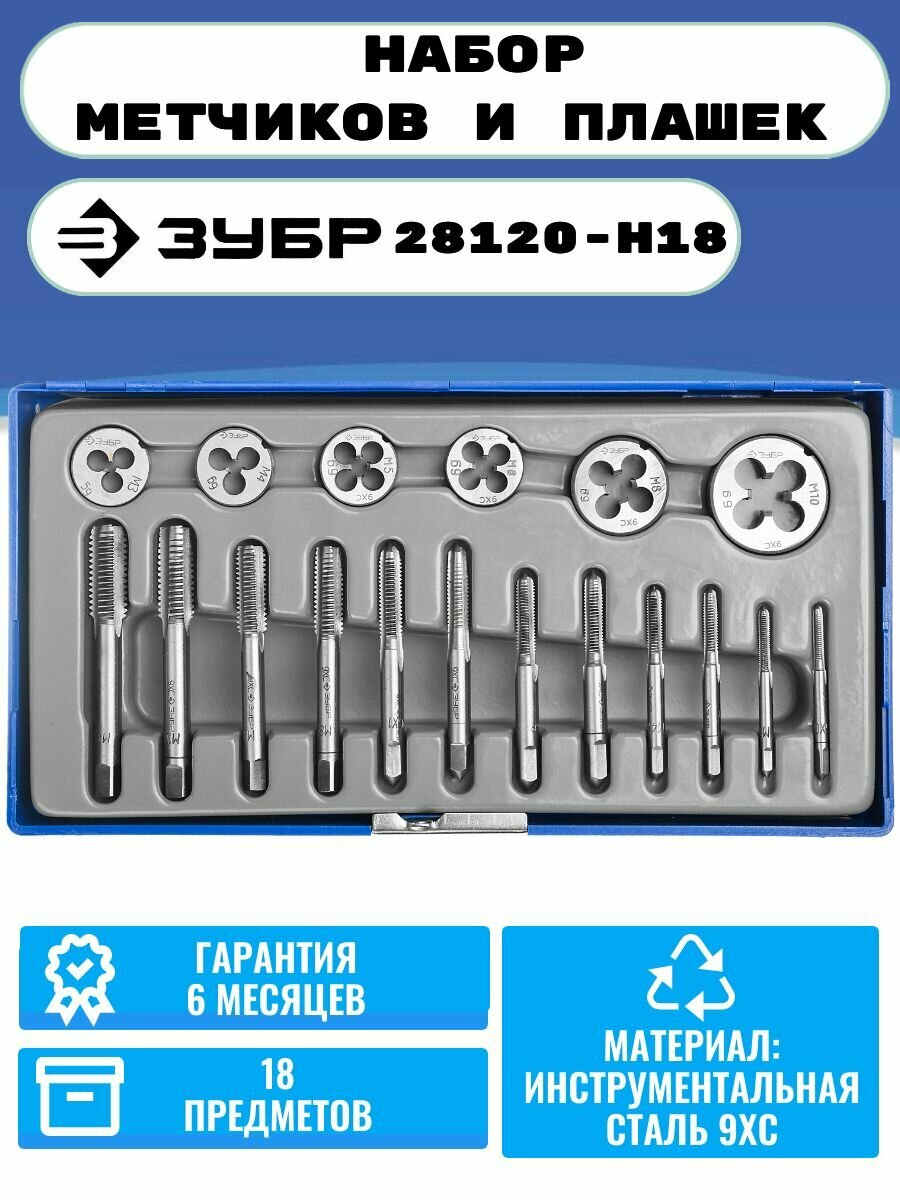 -Комплектация: 18 предметов -Плашки 3х0,5, 4х0,7, 5х0,8, 6х1,0, 8х1,25, 10х1,5 Метчики комплектные 12шт. 3х0,5 -2шт 4х0,7 -2шт 5х0,8 -2шт 6х1,0 -2шт 8х1,25 -2шт 10х1,5 -2ш