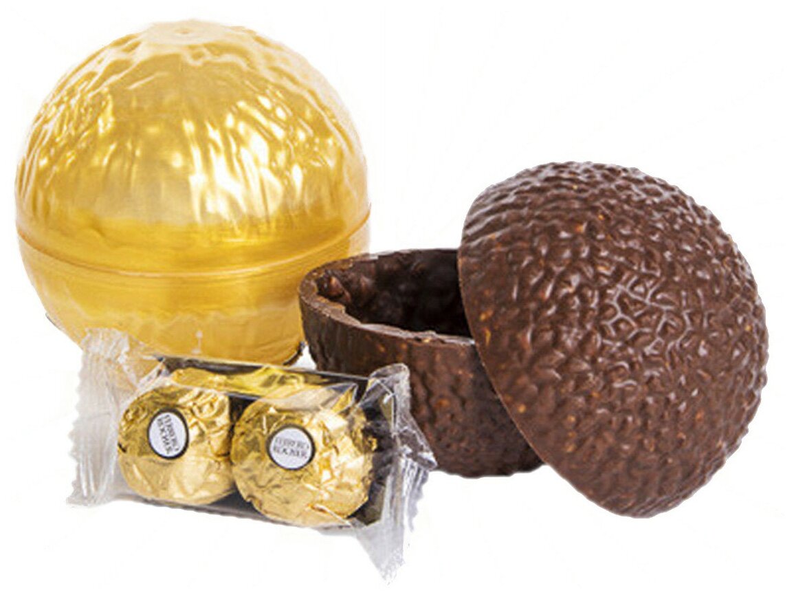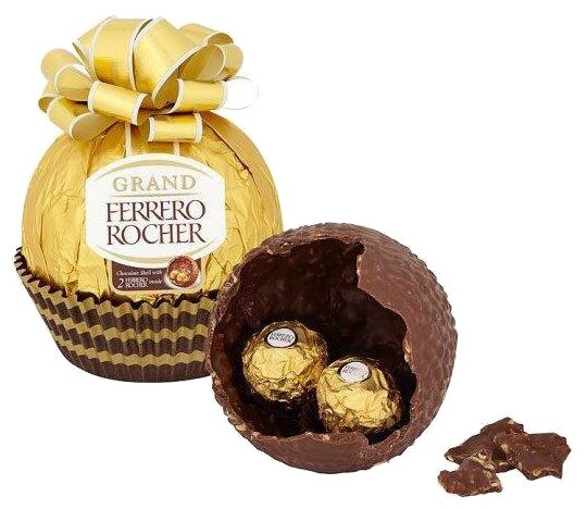 | Комплектация | 2 конфеты внутри шоколадного шара: фигурный молочный шоколад Grand ferrero rocher с дробленными лесными орехами с двумя покрытыми измельченными орешками хрустящими конфетыми ferrero rocher из молочного шоколада с начинкой из крема и лесного ореха |