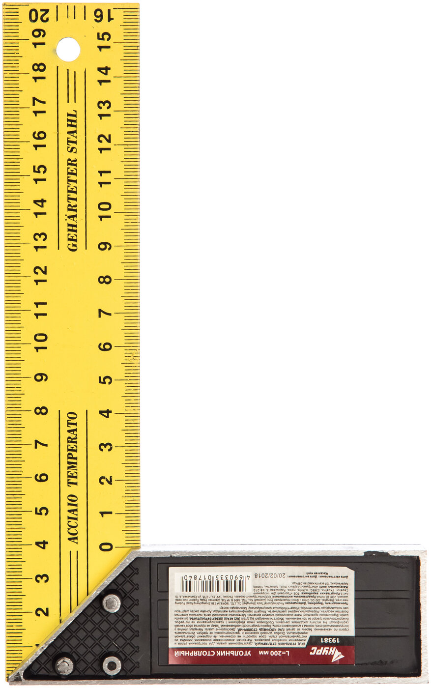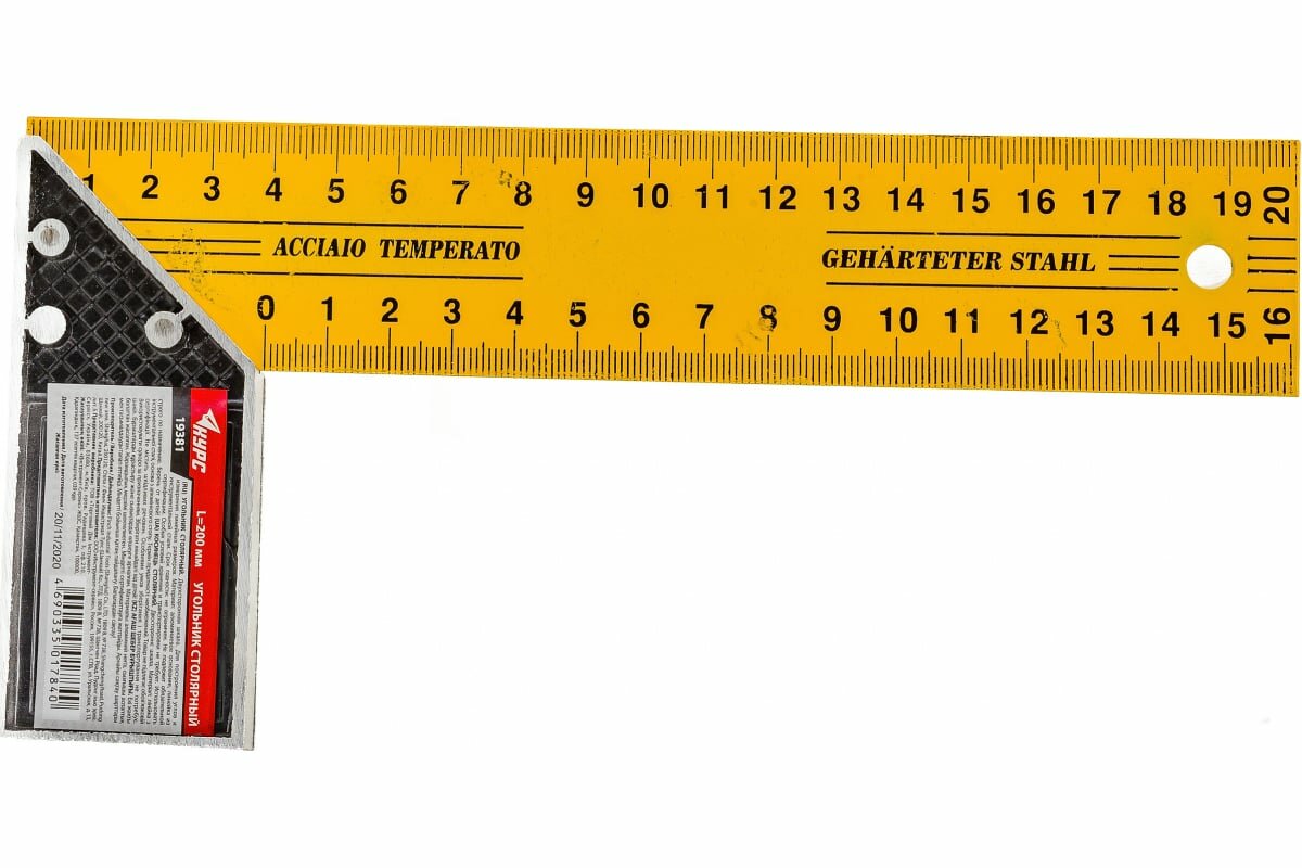 | Дополнительно | Столярный угольник КУРС 200 мм 19381 имеет двухстороннюю шкалу для удобства измерений. Линейка выполнена из инструментальной стали, а основание - из алюминиевого спала. |