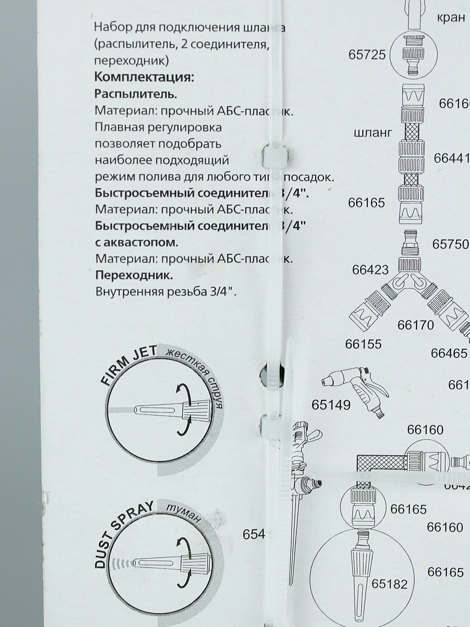 1. Распылитель, материал: прочный АБС-пластик. Благодаря регулируемой форсунке, имеет три режима полива: жесткая струя, распыление типа «туман», конусное распыление, что позволяет выбрать наиболее подходящий режим для любого типа посадок, а также для очистки.