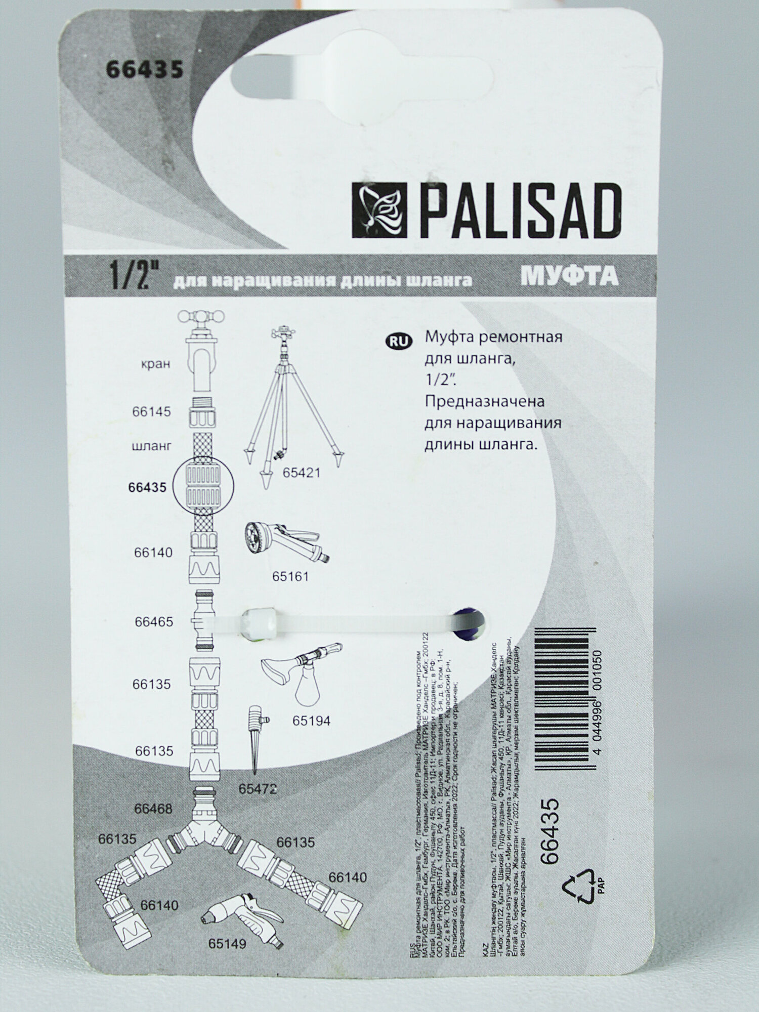 Ремонтная муфта Palisad позволяет соединить шланги диаметром 1/2 дюйма. Благодаря ей не нужно приобретать новый шланг, а можно отремонтировать деформированный. Также с ее помощью можно удлинить поливочную линию.