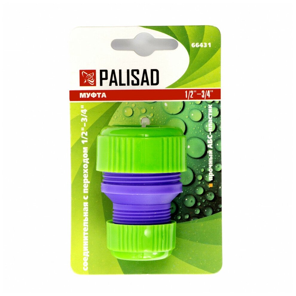 Пластмассовая соединительная муфта Palisad с переходом 1/2-3/4 дюйма обеспечивает возможность создания оросительной системы из шлангов разного размера. Благодаря этому можно удлинить линию для полива больших территорий.