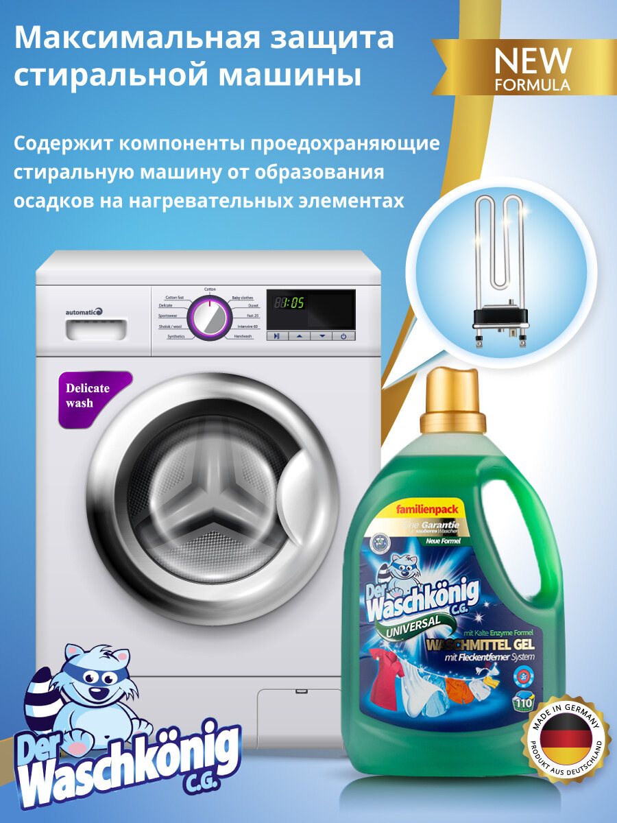 Благодаря жидкой консистенции высококонцентрированный гель для стирки Der Waschkonig C.G. Universal хорошо растворяется в воде, не оставляя пятен или разводов. Гель эффективно стирает ткани с сильными загрязнениями, даже при низких температурах, одновременно защищая их от повреждений. Средство хорошо убирает пятна даже на коротких и экологических режимах стирки. Кроме того, в своем составе гель содержит средства для защиты стиральных машин от коррозии и осаждения накипи.