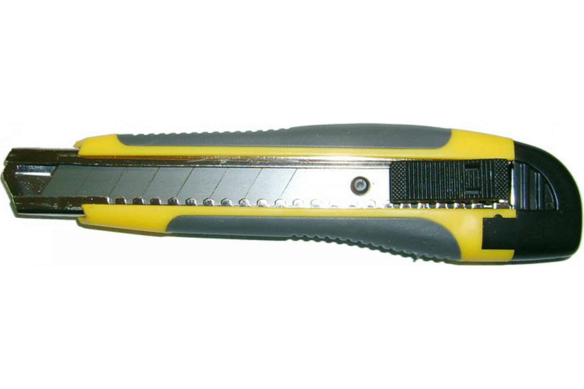 Нож с выдвижным лезвием усиленный 18/0,5 мм, прорезиненный пластиковый корпус, без фиксатора.