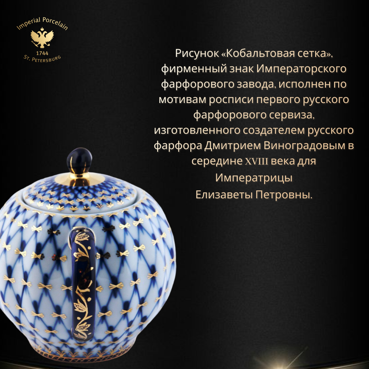 Сахарница рис. "Кобальтовая сетка" на форме "Тюльпан" изготовлена на Императорском фарфоровом заводе из твердого фарфора. Форма отливается вручную. Для декорирования используется ручная подглазурная и надглазурная роспись. Выпуск изделия начался в 1951 году. Рисунок "Кобальтовая сетка" был создан в конце 1944 года художником Анной Яцкевич. Форма "Тюльпан" создана в 1936 году заслуженным художником РСФСР Серафимой Яковлевой. Свою популярность данная форма обрела благодаря рисунку "Кобальтовая сетка" и до сих пор является одной из самых популярных форм завода. За создание этой формы Серафима Яковлева была награждена Золотой медалью на Всемирной выставке в Брюсселе (1958 год). Объем - 450 мл, высота - 11.2 см., вес - 328 грамм. Чтобы сохранить первоначальный вид товара, мы рекомендуем мыть его вручную.