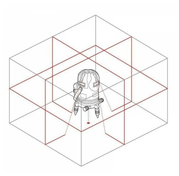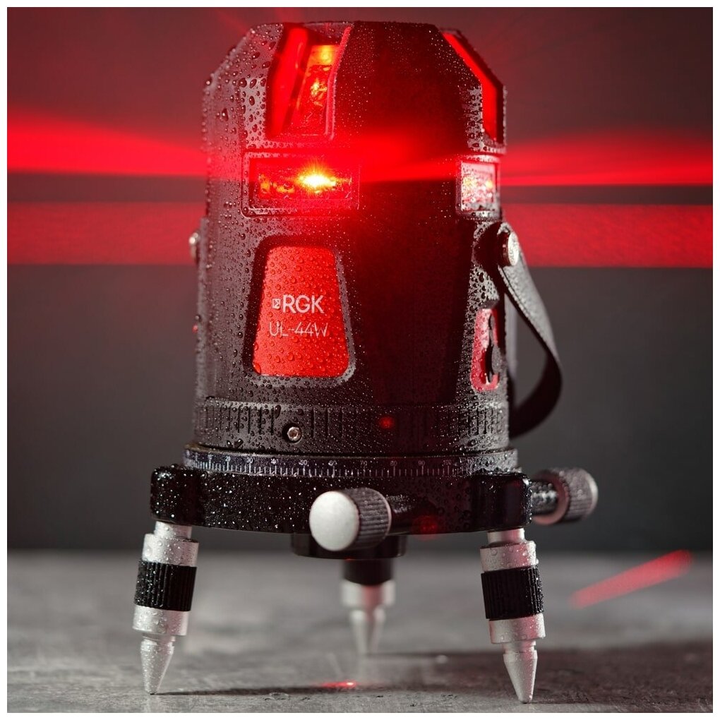 RGK — линейный лазерный уровень с яркими лучами и высокой точностью построения (до 0,1 мм на метр). Может применяться для выполнения сложных задач, поскольку проецирует 5 плоскостей. При разметке не требуется переносить проекцию на другую стену. С лучами можно работать при любом освещении на дистанции до 50 метров, если пользоваться приемником, и до 20 метров без приемника. Питание — от аккумулятора либо обычных батарей типа AA. Поставляется в кейсе.