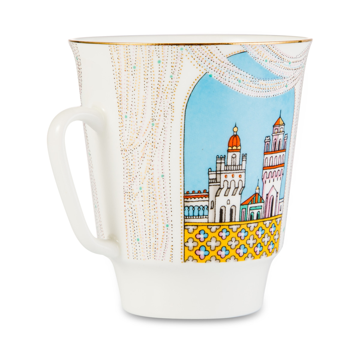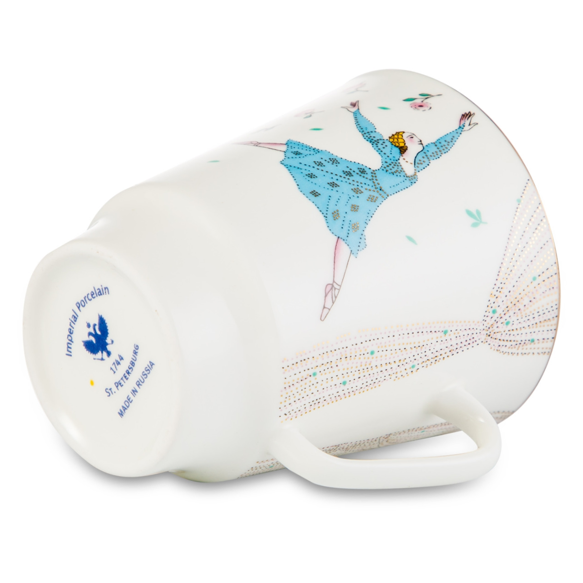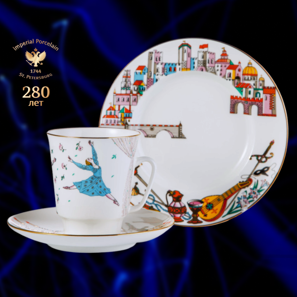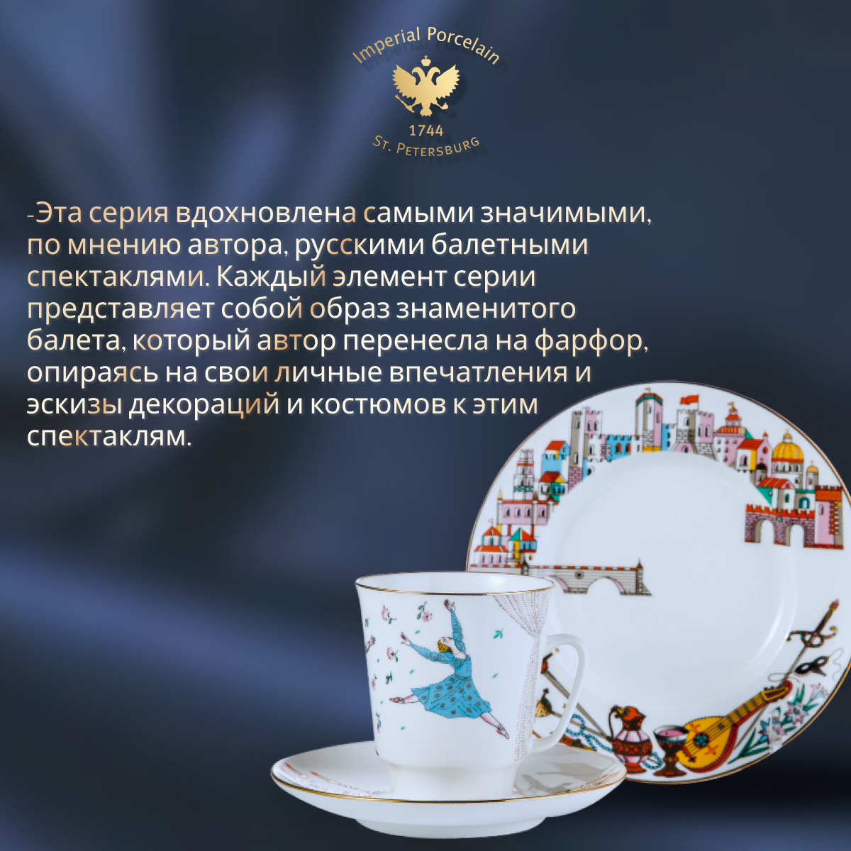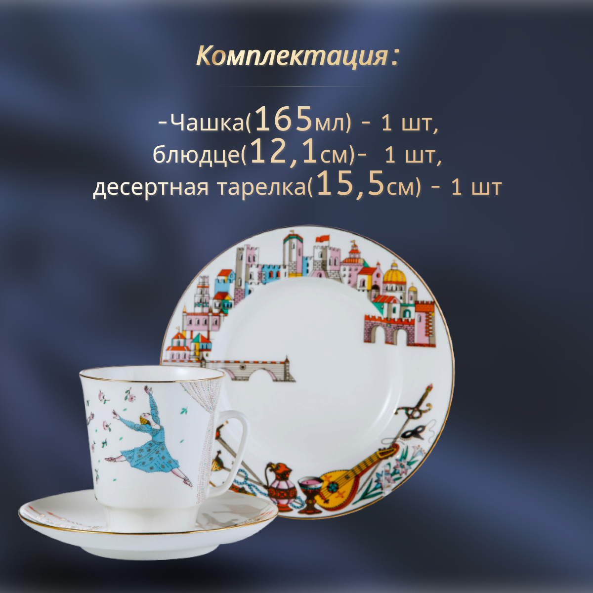 Комплект изготовлен на Императорском фарфоровом заводе из костяного фафрора. Для декорирования используется надглазурная деколь, отводка золотом. Автор рисунка - Любовь Цветкова, автор формы - Эдуард Криммер. Выпуск изделия начался в 2014 году. Комплект включает в себя 3 предмета: чашка (165 мл), блюдце, десертная тарелка. Это изделие не подходит для мытья в посудомоечной машине. Чтобы сохранить первоначальный вид товара, мы рекомендуем мыть его вручную.