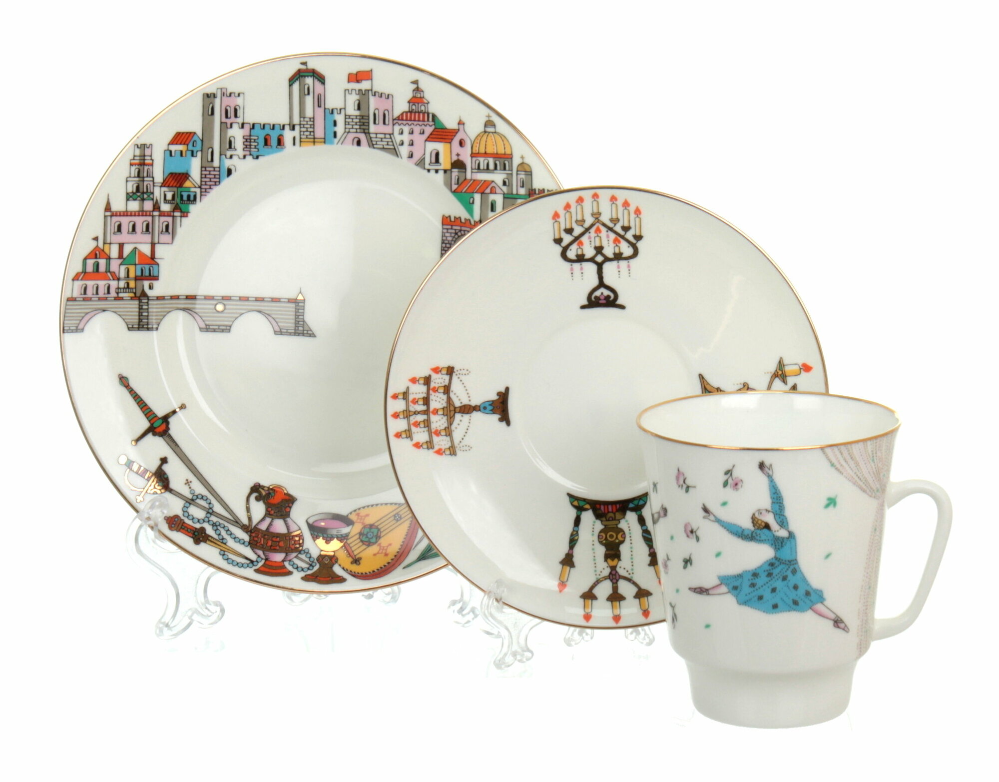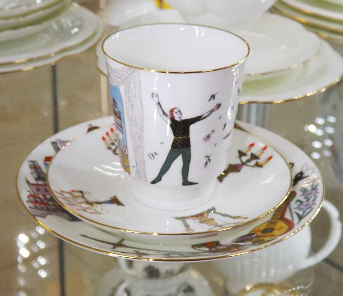 Комплект кофейный 165 мл. Форма "Майская" рисунок "Балет. Ромео и Джульетта". Костяной фарфор. 3 предмета. Кофейная пара с десертной тарелкой. ИФЗ