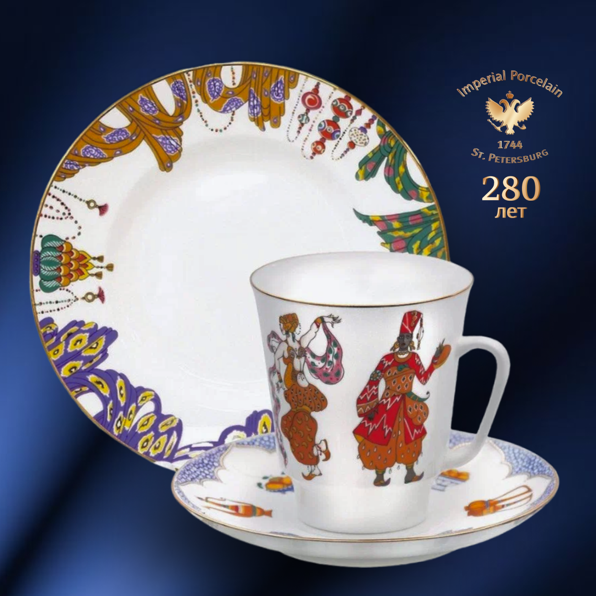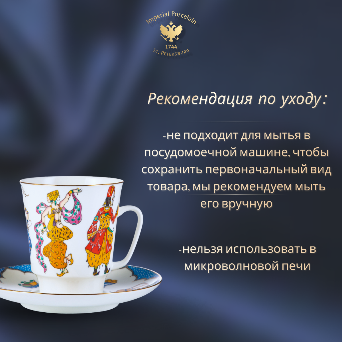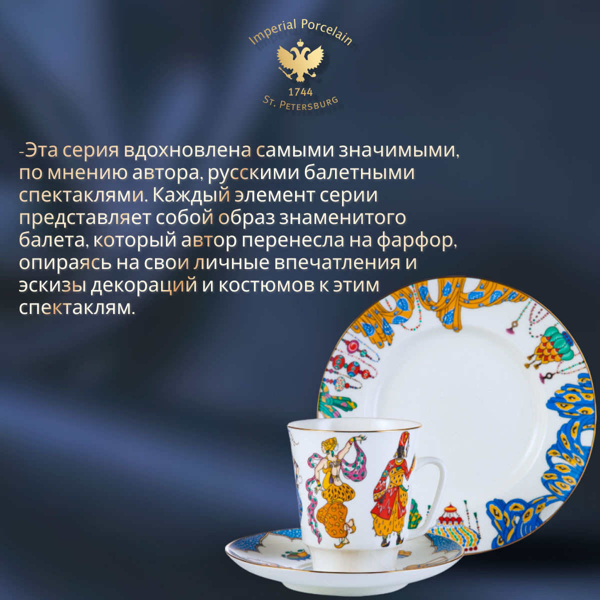 Комплект изготовлен на Императорском фарфоровом заводе из костяного фарфора. Для декорирования используется надглазурная деколь, отводка золотом. Автор рисунка - Любовь Цветкова, автор формы - Эдуард Криммер. Авторская модель создана в 24 году. Объем чашки - 165мл, высота - 7,7 см.