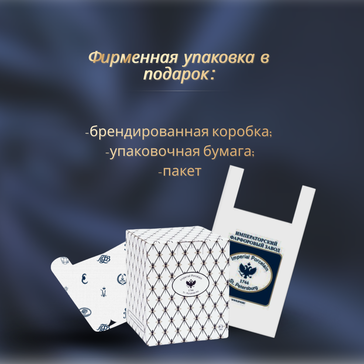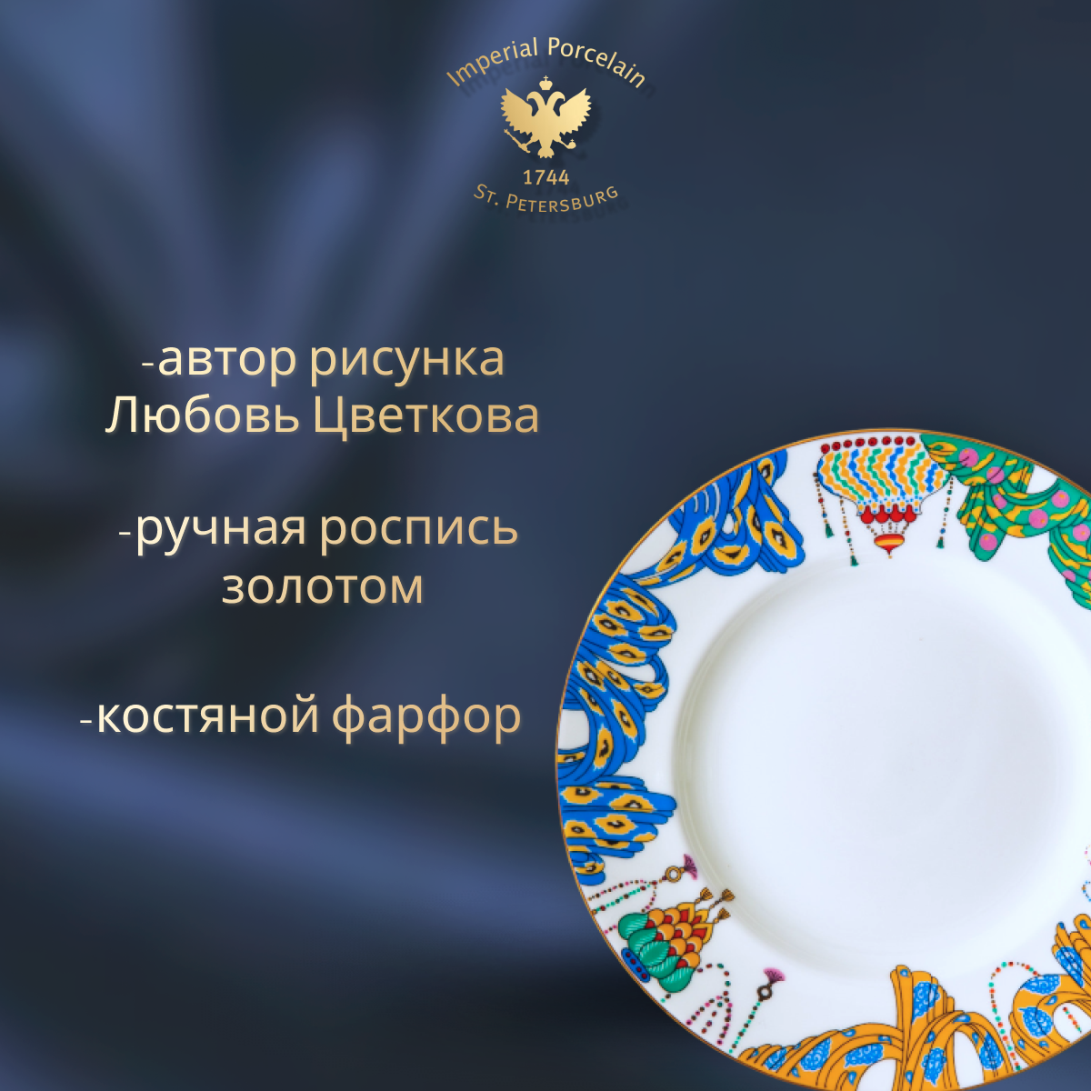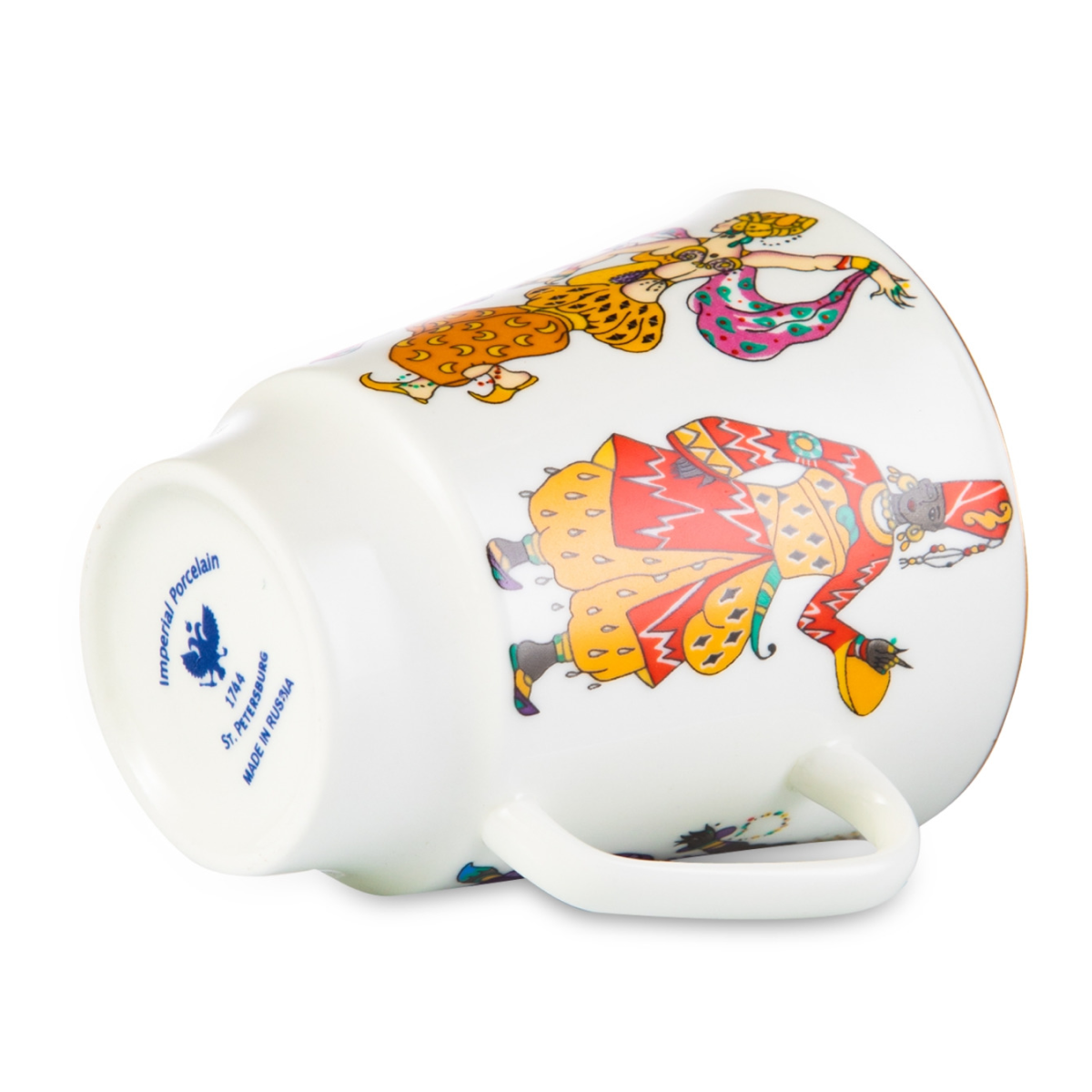 Комплект изготовлен на Императорском фарфоровом заводе из костяного фарфора. Для декорирования используется надглазурная деколь, отводка золотом. Автор рисунка - Любовь Цветкова, автор формы - Эдуард Криммер. Авторская модель создана в 24 году. Объем чашки - 165мл, высота - 7,7 см.