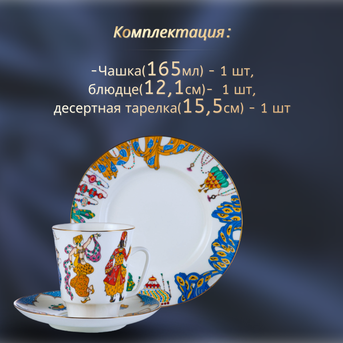 | Состав набора | десертная тарелка - 1 шт.; блюдце - 1 шт.; чашка - 1 шт. |