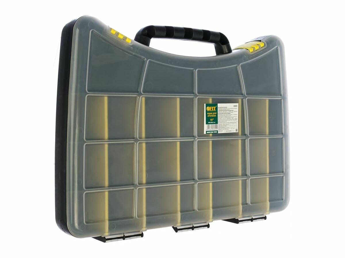 | Прочие особенности и свойства | Пластиковый ящик FIT 65652 выполнен в форме кейса, служит для хранения и переноски крепежных изделий. Состоит из 22 отделений, где удобно размещаются необходимые аксессуары и различные мелочи. С помощью переставных перегородок можно регулировать размеры ячеек, чтобы максимально эффективно использовать имеющееся внутри пространство. Прозрачная крышка позволяет видеть расположение крепежа внутри. Две пластиковые защелки надежно защищают чемоданчик от непреднамеренного открывания.,Размеры:400х300х60 мм. |